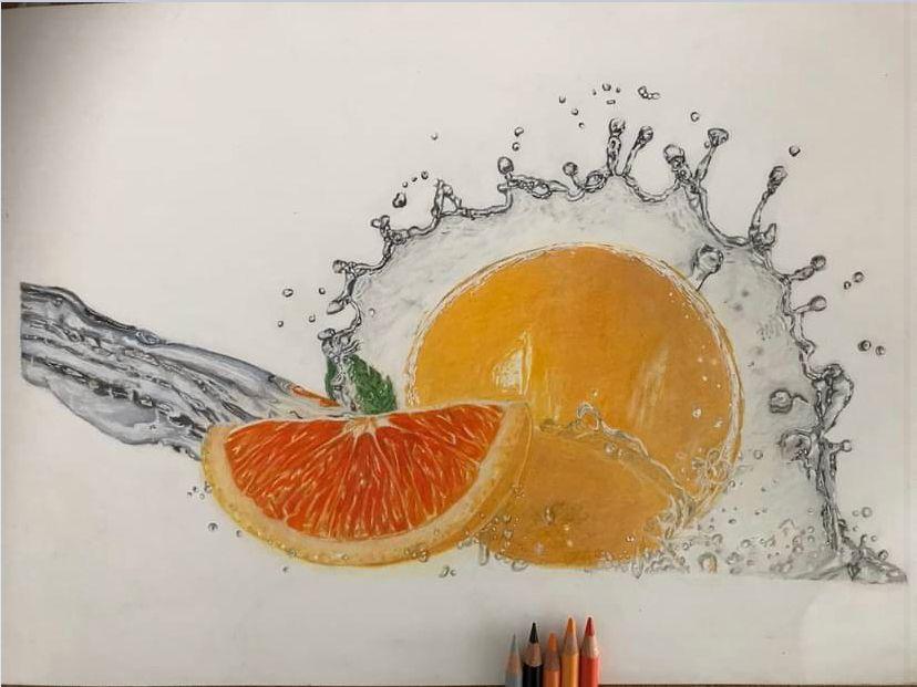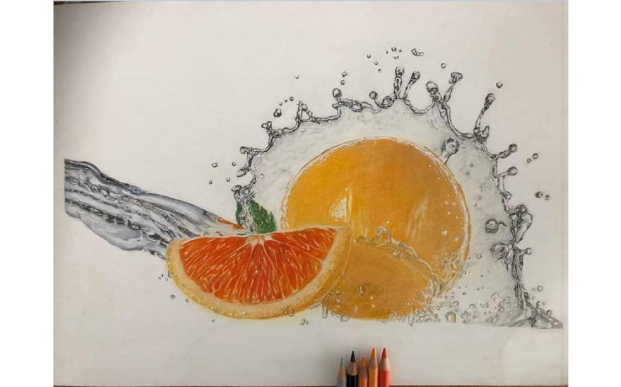 “The Orange” is a colour pencil on paper on a 20×18-inch , expertly portraying the allure and vibrancy of this citrus fruit. The artist’s skillful shading and detail bring out the depth and texture, inviting viewers to appreciate the beauty of nature’s palette encapsulated in a single orange.