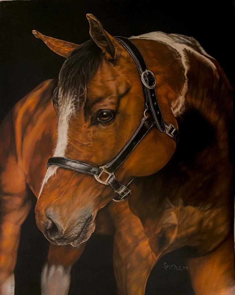 “Horse’s Tale in Hues” is a colour pencil on paper piece on an 18×20-inch , showcasing the story of the horse through a vibrant interplay of shades and tones. Each pencil stroke tells a tale of grace, strength, and freedom, portraying the essence of these magnificent creatures in an intricately detailed and artistic manner.